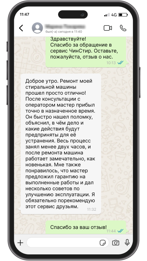 Большое спасибо за качественный ремонт стиральной машины! Мастерам удалось устранить все проблемы, и теперь машинка работает как новая. Кроме того, они дали мне полезные советы по уходу и эксплуатации. Рекомендую этот сервис всем, кто нуждается в ремонте стиральной машины.